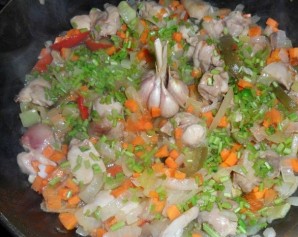 1. Замочіть рис. Цибулю та моркву наріжте невеликими кубиками. Візьміть болгарський перець кількох кольорів і дрібно поріжте. Обсмажте цибулю на сковороді з розігрітим маслом, додайте моркву, солодкий перець. В центр сковороди покладіть цілу, неочищену головку часнику, наріжте петрушку і додайте до овочів. Туди ж викладіть нарізане куряче м'ясо. Тушкуйте все 8-10 хвилин. Потім додайте томат, протертий через сито або м'ясорубку.