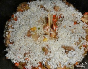 2. Попередньо замочене рис додайте до решти інгредієнтів через кілька хвилин після томатів. Після рису додайте до сковороди кукурудзу, зелений горошок.