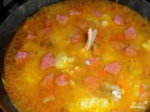 3. До інгредієнтів на сковороді додайте нарізану шматочками ковбасу. Залийте гарячим бульйоном, заправленим куркумою. Накрийте кришкою, обгорнутою рушником. Тушкуйте страву на слабкому вогні не більше 20 хвилин.
