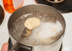6. Через 15 хвилин доведіть до кипіння воду в каструлі, додайте солі та по одному кидайте ньоккі у киплячу воду. Коли вода знову закипить, а ньоккі спливатимуть — вони готові. Вийміть їх шумівкою до тарілки.