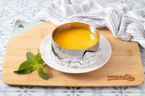 Розлийте отриману масу по формочкам або у склянку. Я використовую кулінарне кільце, дно якого вистелив фольгою та харчовою плівкою. Охолодіть до кімнатної температури та поставте в холодильник на 2-3 години.
