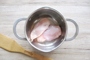 Куриное филе вымойте, выложите в кастрюлю, залейте водой, посолите и варите 15-20 минут с момента закипания.