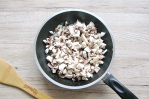 Грибы вымойте, если нужно очистите, нарежьте мелко и добавьте в сковороду к луку.