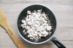Отварную куриную грудку мелко нарежьте и выложите в сковороду с мукой.
