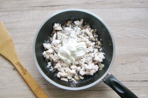 Смесь курицы, лука, грибов, муки и сметаны выложите в форму для запекания.