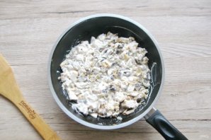Помешивая, на среднем огне, обжаривайте грибы с луком 5-7 минут.