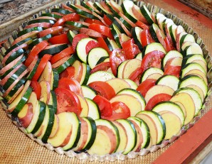2. Тепер гарно викладаємо по колу, чергуючи різні овочі. Додаємо сіль і спеції за смаком і посипаємо дрібно натертим сиром.