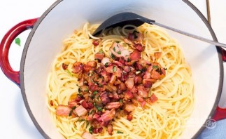 Злити воду зі спагеті, промити їх. Додати смажену заправку та соус. Можна підігріти страву.