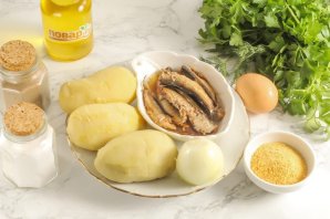 Выложите горячие картофельные биточки с луком и шпротами на тарелку и подайте к столу.
