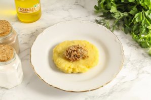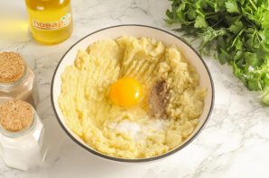 Отварной картофель очистите от кожуры и тщательно разомните вилкой в пюре. Не готовьте биточки из картофельного пюре, так как вы не сможете его слепить, оно будет не таим плотным, как пюре из отварного целого картофеля. Вбейте в картофельную массу небольшое куриное яйцо, всыпьте соль и перец. Можно добавить и другие специи, пряности по вкусу.