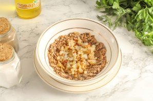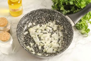 Репчатый лук очистите от кожуры и промойте в воде. Нарежьте мелкими кубиками и отпассеруйте в растительном масле на сковороде примерно 3-5 минут до румяности.