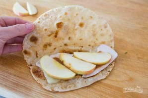 4. Снимите лепешку со сковороды и переложите на доску. Нарежьте яблоки тонкими ломтиками и выложите поверх курицы, добавьте ломтики сыра, накройте второй половинкой.