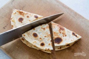 Рецепт не отнимет много времени. Нет традиционных продуктов? Не беда, воспользуйтесь привычными, теми, что всегда под рукой. Готовую кесадилью (лепешку), можно сделать самостоятельно, но можно также купить готовые лепешки. Подавайте закуску сразу после приготовления, также можно есть ее после остывания. Такая закуска отлично подходит для перекуса на природе или в школе Подавайте закуску к столу.