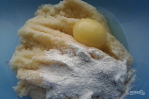 До картоплі з цибулею додайте борошно і яйце. Змішайте суміш.