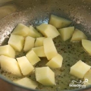 2. Картоплю почистити і нарізати невеликими кубиками. В каструлю покласти картоплю і налити воду або овочевий бульйон. Довести до кипіння і варити картоплю близько 10 хвилин, закривши каструлю кришкою.