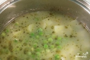 3. Після цього додайте до каструлі зелений горошок і варіть п'ять хвилин. Горошок повинен зваритися.