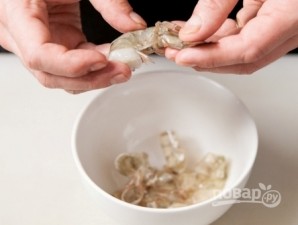 Якщо у вас неочищені креветки, насамперед почистіть їх. Почищені креветки посолити, збризніти лимонним соком і залишити на 5-10 хвилин.