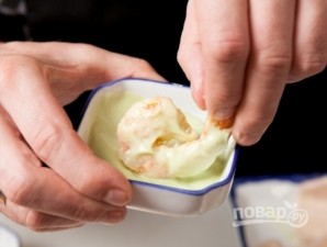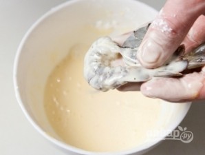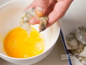 Поставити розігріватися сковороду або сотейник з маслом. Збиваємо яйце, обмакуємо в нього креветки (по одній), надлишки нехай стікають. Відкладаємо креветки на тарілку.