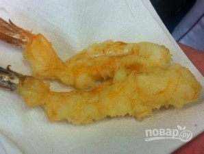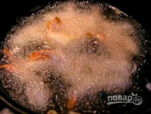 Масло на сковороді добре прогрілося. Опускаємо креветку у тісто.