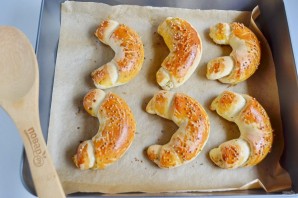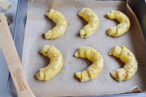 На пергамент уложите рогалики на расстоянии друг от друга. Смажьте желтком, посыпьте морской солью, прованскими травами, зернами горчицы.