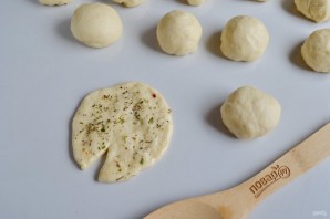 Смажьте рабочую поверхность растительным маслом. Каждый шарик раскатайте так, чтобы с одной стороны был вытянутый край, а другой край разрежьте, как на фото. Смажьте лепешку растительным маслом с двух сторон, посыпьте прованскими травами с внутренней стороны.