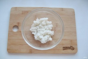 Пока тесто подходит, приготовьте начинку для кулебяки. Отварной рис выложите в миску.