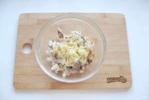 Репчатый лук очистите, помойте и мелко нарежьте. Поджарьте до золотистого цвета в сковороде. Добавьте в начинку.