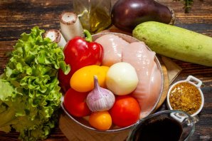 Подготовьте все необходимые продукты для приготовления курицы с овощами.