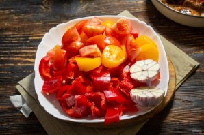 Сладкий перец очистите от семян и нарежьте кусочками. Помидоры — тоже средним кубиком. Чеснок очистите от верхней шелухи и разрежьте пополам.