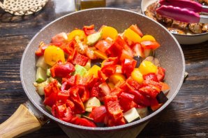В сковороду к овощам добавьте нарезанные помидоры, перец и чеснок.