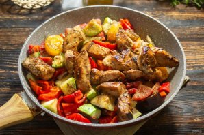 Добавьте обжаренную куриную грудку, перемешайте все содержимое сковороды. Убавьте нагрев до минимального и тушите под крышкой 10-15 минут.