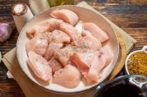Куриное филе нарежьте средними кусочками. Приправьте черным молотым перцем.