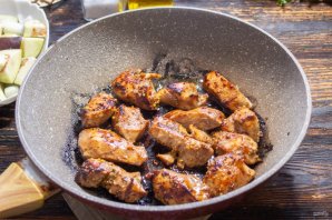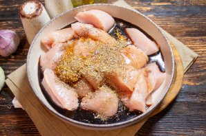 Глубокую сковороду нагрейте, налейте масло и обжарьте маринованную куриную грудку до румяности. Жарьте на сильном нагреве, чтобы курица покрылась румяной корочкой.