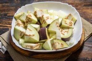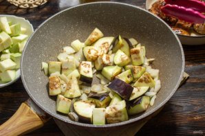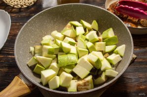Добавьте кабачки в сковороду к баклажанам и жарьте вместе еще несколько минут, чтобы овощи слегка подрумянились.