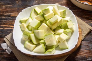 Лук нарежьте средним кубиком. Баклажан нарежьте крупными кусками.