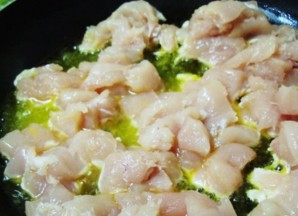 Филе и лук порежьте кубиками, грибы пластинками. Затем мясо обжарьте на сильном огне на растительном масле.