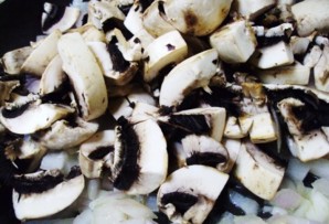 Мясо выложите, а в оставшемся масле обжарьте лук до прозрачности, затем добавьте грибы и немного протушите.