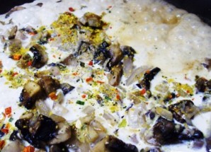 После этого добавьте тертый сыр и специи по вкусу. Протушите до загустения соуса.