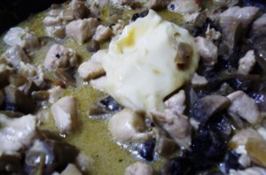 Влейте сливки, доведите до кипения, затем добавьте мясо.