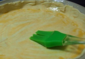 Тесто разделите на две части и раскатайте. Выложите один лист теста в форму для запекания.