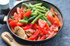 Потім додайте до м'яса шматочки помідорів, солодкого перцю та зеленої стручкової квасолі. Квасолю можете використовувати як свіжу, так і заморожену.