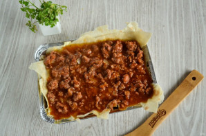 Викладіть решту м'ясної начинки. Обов'язково виливайте всю рідину, з нею лазанья вийде дуже сочною.