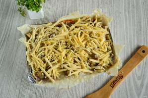Накрийте все аркушем лаваша, викладіть решту грибів і посипте тертий сиром.