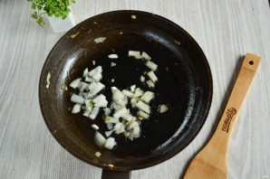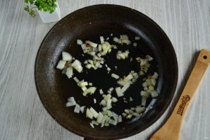 Перш за все займіться начинкою. Одну цибулину наріжте дрібним кубиком і викладіть на розігріту сковороду з рослинною олією.