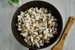 Гриби очистіть і наріжте дрібним кубиком. Викладіть у сковороду до цибулі та смажте до готовності.
