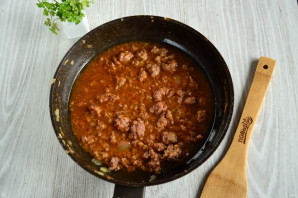 Потім влийте в сковороду томатний сік (можна використовувати томатну пасту, розведену у склянці води), перемішайте і тушкуйте, доки сік не випариться наполовину.