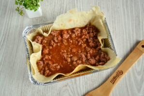 Тепер починайте збирати лазанью. Форму потрібного розміру викладіть аркушем лаваша, щоб краї піднімалися вгору. На дно викладіть половину м'ясної начинки.