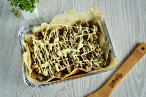 Викладіть гриби (я залишаю трохи для останнього шару), зверху змастіть майонезом або вершковим сметаною. Можна полити соусом «Бешамель», як у класичному варіанті, але з майонезом теж дуже смачно. Знову накрийте аркушем лаваша.