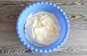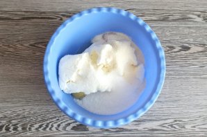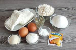 Приготовьте начинку. Смешайте в чаше творог, 100 грамм сахара, 2 яйца, манку, соль, ванилин по вкусу.