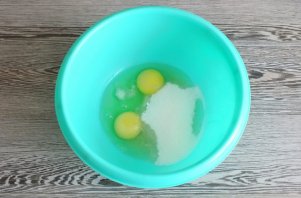 Приготовьте тесто для ватрушки. Смешайте в чаше 2 яйца, 100 грамм сахара, ванилин и щепотку соли.